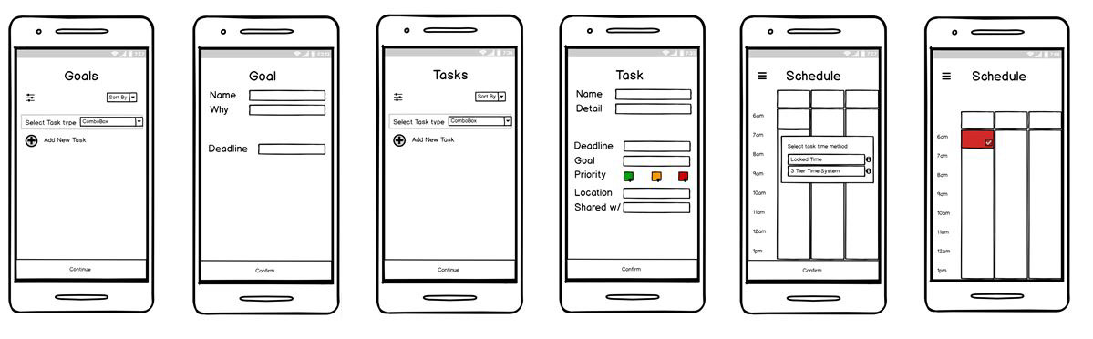 Following the implementation theory, a user first sets their goals, then adds a task, assigning it to a specific goal, before slotting it into their schedule. One of the requirements based on interviews was to consider deadlines and times. In this process, I added 2 deadline options, one that is more intrusive and one that is not. This is an attempt at avoiding users becoming overwhelmed with too many incomplete tasks as a result of a busy day and provides more flexibility when needed. This was important as insight in the interview phase showed that most people don't get all their tasks complete that they set, or in the original time frame that they have wanted.